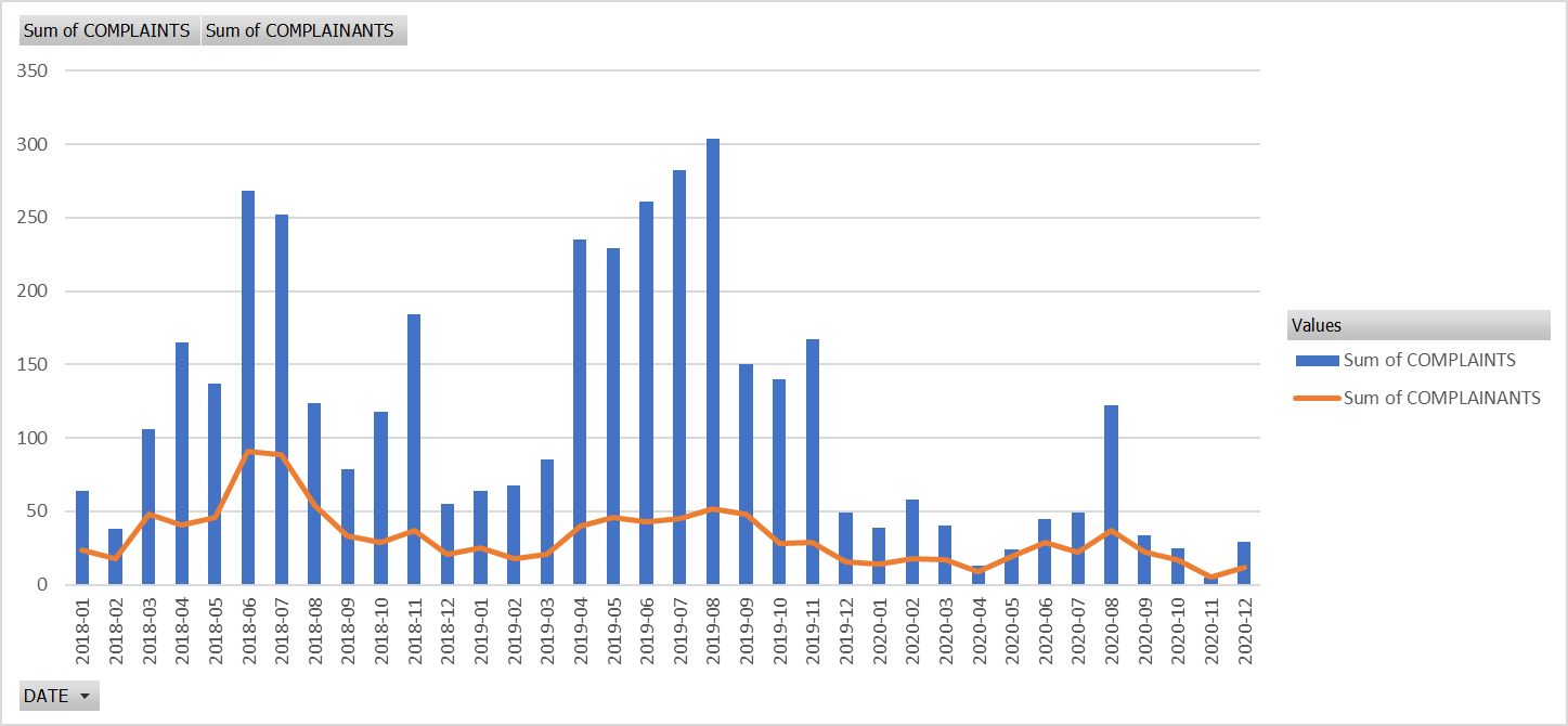 The table below provides data on complaints v complainants per month over the preiod 2018 - 2021 inclusive. It provides you with an overview of the number of complainants contacting Edinburgh Airport over that period. As you can see from the graph below, despite a significant reduction in operations during 2020/2021 due to the world wide COVID pandemic, complaints from our frequent complainants continued in a similar pattern to previous years.